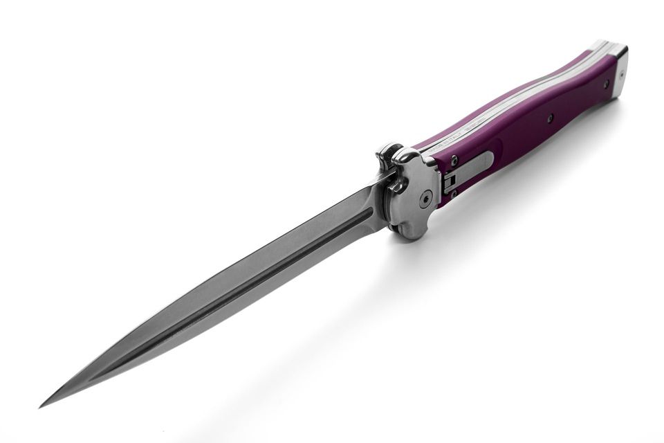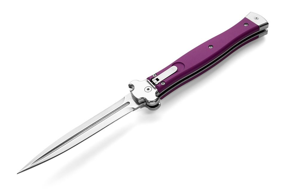 AGA Campolin Zero + Purple Aluminum Leverlock Automatic Knife Dagger Polished Plain. ZERO+ is a modern stiletto with leverlock mechanism and is the longest leverlock available!! It has a stainless steel N690Co Daga blade with polished mirror finish and a solid AISI 430 steel glass blasted bolster. The double spring gives faster action and guarantees longer durability. The inverted lever gives a quick opening action. The Turquoise Aluminium handle has a 3d texture for a better grip. The stainless steel pocket clip can be easily removed and replaced with a steel shield. ZERO+ is covered by 1 year warranty from the original end user's purchasing date. Overall length: 26cm - 10.25" Blade length: 12cm - 4.7" Blade thickness: 3.5mm - 0.14" Weight: 215g - 7.6oz Blade material: N690Co Stainless Steel Handle material: Aluminium Made in: Italy