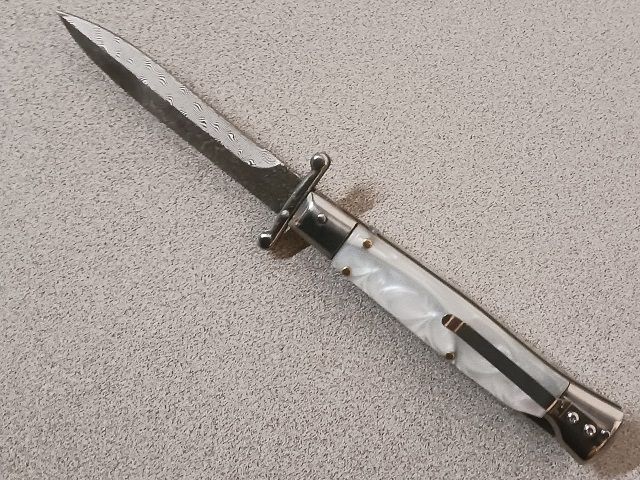 AKC 9 inch Swinguard Italian Stiletto Automatic Knife Pearl White Damascus. Overall length: 23cm – 9" Blade Length: 10,50 cm – 4,125" Blade Thickness: 3,5mm – 0,34" Weight: 108 gr Blade Material: Stainless steel Handle Material: Pearl White Frame material: damascus steel