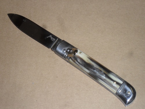 AKC Brazilian Horn Leverlock Side Opening Automatic Knife.AKC Italy makes this classic 8” leverlock knife. Drop-point blade and very beautiful all around. Stainless steel bolsters and Brazilian cow horn scales on this one. Overall Length: 20cm - 7.8" Drop-point blade length: 8,2cm - 3.25" Blade thickness: 2,7mm - 0.11" Weight: 120 gr Blade Material: Stainless steel Handle Material: brazilian cow horn Frame Material: Brass Made in: Italy