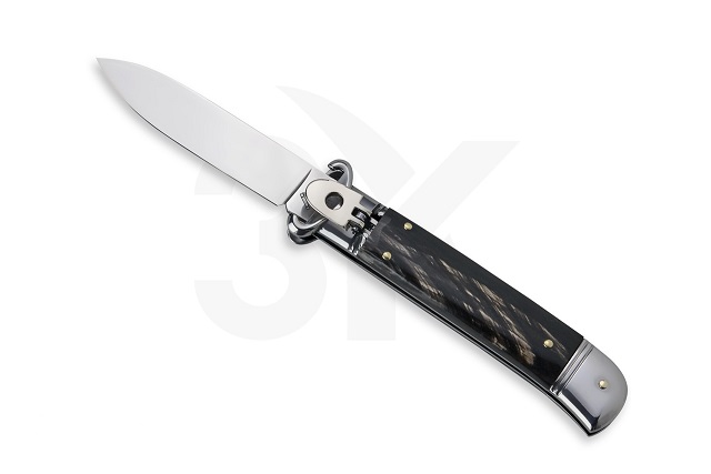 AKC Buffalo Horn Leverlock Side Opening Automatic Knife.AKC Italy makes this classic 8” leverlock knife. Is a classic hunting knife with a lot of charme. Drop-point blade. Beautiful all around, good proportions, is a nice everyday use side opening knife. Stainless steel bolsters and Buffalo horn scales on this one. Note: as is a natural material, colour, texture and pattern will vary from knife to knife. Overall Length: 20cm - 7.8" Drop-point blade length: 8,2cm - 3.25" Blade thickness: 2,7mm - 0.11" Weight: 120 gr Blade Material: Stainless steel Handle Material: Buffalo horn Frame Material: Brass Made in: Italy