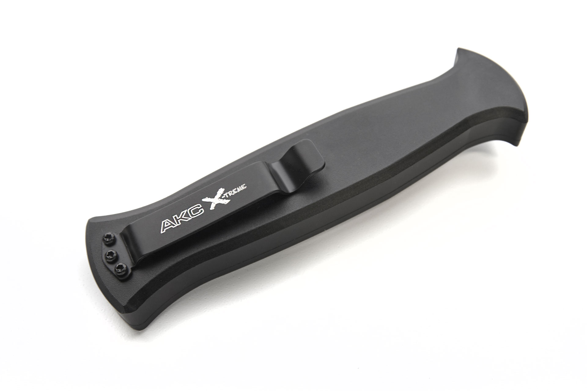 The AKC X-TREME made with modern materials and an aggressive italian design increased the standard of their OTF production. This new automatic model "EVO", short for EVOLUTION, is the modern version of an old OTF Angelo Campolin Sr. made in the 70's for the Solingen/Germany company Otello. The ergonomic black handle and button are made using solid CNC worked 6061-T6 aircraft aluminium. The plain grind dagger blade on this switchblade is made of AUS-8 japanese steel with a HRC of 58-59 and has a PVD coated finish. It includes a black pocket clip. This OTF fires fast and has minimum bladeplay. Overall Length: 21.5 cm - 8.46" Blade Length: 9cm - 3.54" Blade Thickness: 3mm - 0.12" Weight: 120gr - 4.2ozBlade Material: AUS-8 Japanese Steel Handle Material: Aluminium Made in: Taiwan