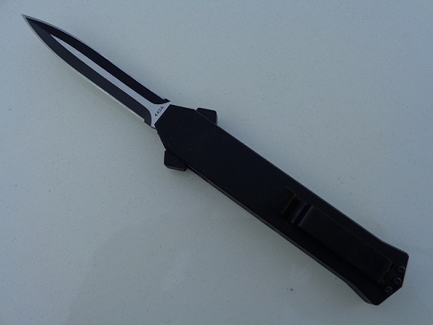 AKC F-16 Black Grip D/A OTF Automatic Knife Two Tone Dagger. Overall Length: 20cm - 8" Blade Length: 8.5cm - 3.35" Blade thickness: 3mm - 0.12" Weight: 88 g - 3.10 oz. Blade Material: 440A Stainless steel Handle Material: Aluminium Black Inlay Material: Black Grip