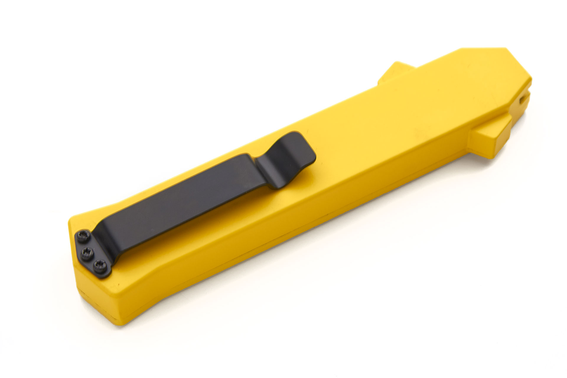 AKC F-16 D/A Yellow OTF Automatic Knife Satin Dagger 3.35 Inches. Overall Length: 20cm - 8" Blade Length: 8.5cm - 3.35" Blade thickness: 3mm - 0.12" Weight: 90g - 3.1oz.Blade Material: 440A Stainless Steel Handle Material: Aluminium Inlay Material: Sandpaper