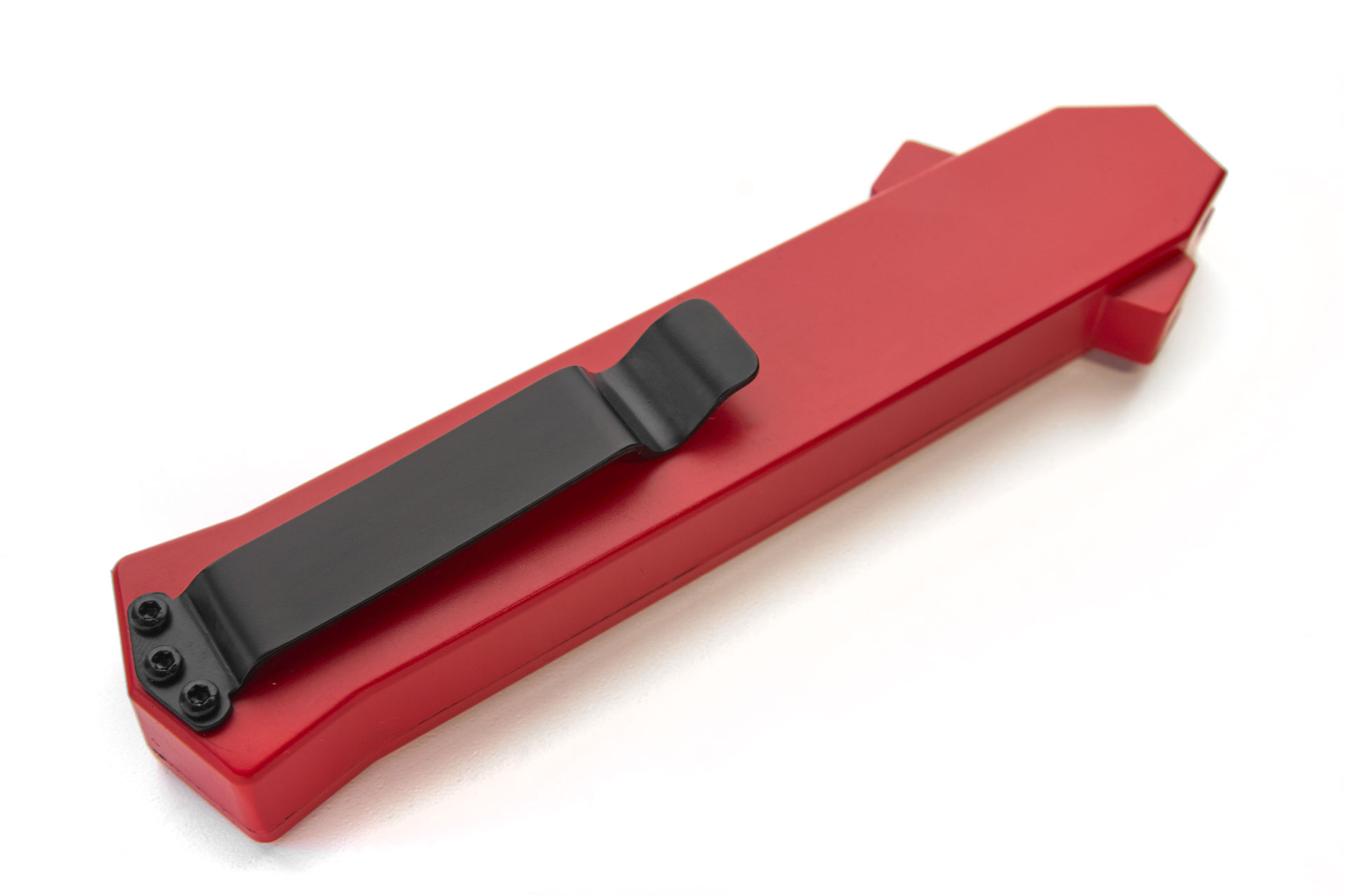 AKC F-16 Red Grip OTF Automatic Knife Two Tone Bayo. Overall Length: 20cm - 8" Blade Length: 8.5cm - 3.35" Blade thickness: 3mm - 0.12" Weight: 88 g - 3.10 oz.Blade Material: 440A Stainless Steel Handle Material: Aluminium Inlay Material: Sandpaper