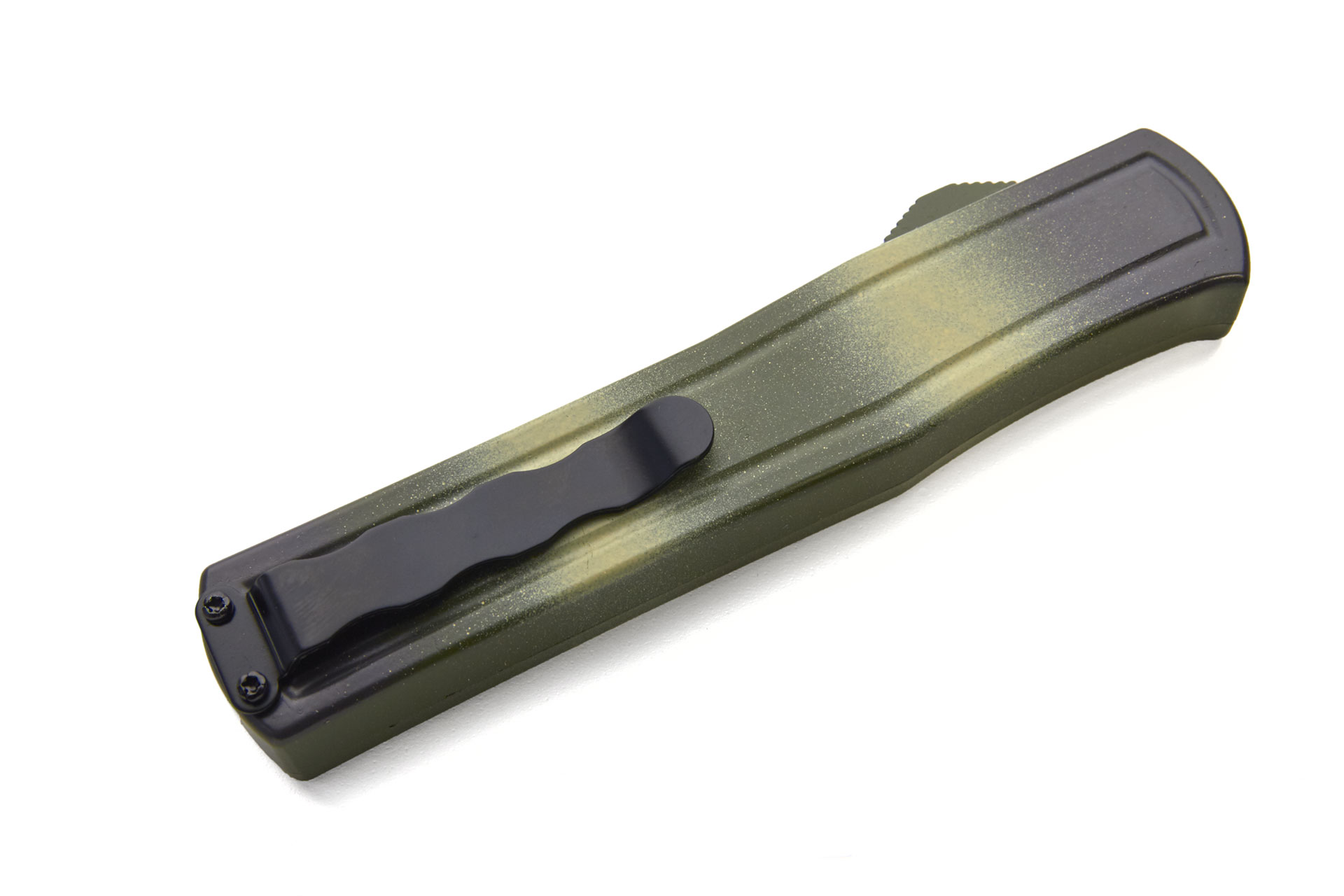 This new great ergonomic OTF from AKC Italy F20 is excellent quality. It is 0.5" (1.3cm) longer than it's smaller brother the F16. The ergonomic handle on this automatic switchblade is made of aluminum with black sandpaper insert for a safe grip. The razor sharp particular 440A steel drop point blade has a very nice grind and comes in satin finish. It has a strong solid mechanism with almost zero blade play. The price quality is the best you can find. You will not be disappointed with it! Overall Length: 21.3cm - 8.4" Blade Length: 9.3cm - 3.6" Weight: 105g - 3.7ozBlade Material: 440A Stainless Steel Handle Material: Aluminum Inlay Material: Sandpaper
