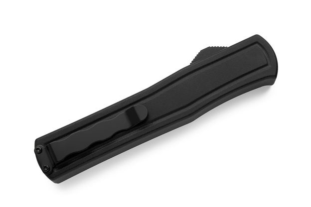 AKC F-20 D/A Drop Point OTF Auto Black White Satin. This new great ergonomic OTF from AKC Italy F20 is excellent quality. It is 0.5" (1.3cm) longer than it's smaller brother the F16. The ergonomic handle on this automatic switchblade is made of aluminum with black sandpaper insert for a safe grip. The razor sharp particular 440A steel drop point blade has a very nice grind and comes in satin finish. It has a strong solid mechanism with almost zero blade play. The price quality is the best you can find. You will not be disappointed with it! Overall Length: 21.3cm - 8.4" Blade Length: 9.3cm - 3.6" Weight: 105g - 3.7oz Blade Material: 440A Stainless Steel Handle Material: Aluminum Inlay Material: Copper