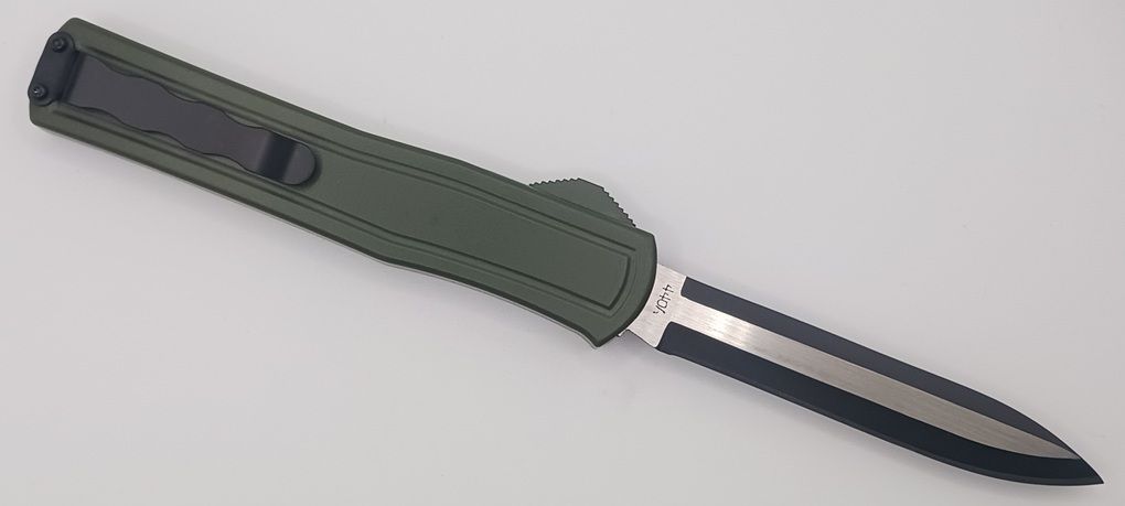 AKC F-20 D/A OTF Automatic Knife Army Green Two Tone Drop Point (8.4" Overall). This new great ergonomic OTF from AKC Italy F20 is excellent quality. It is 0.5" (1.3cm) longer than it's smaller brother the F16. The ergonomic handle on this automatic switchblade is made of aluminum with black sandpaper insert for a safe grip. The razor sharp 440A steel dagger blade has a very nice grind and comes in black finish. It has a strong solid mechanism with almost zero blade play. The price quality is the best you can find. You will not be disappointed with it! Overall Length: 21.3cm - 8.4" Blade Length: 9.3cm - 3.6" Weight: 105g - 3.7oz Blade Material: 440A Stainless Steel Handle Material: Aluminum Inlay Material: Sandpaper