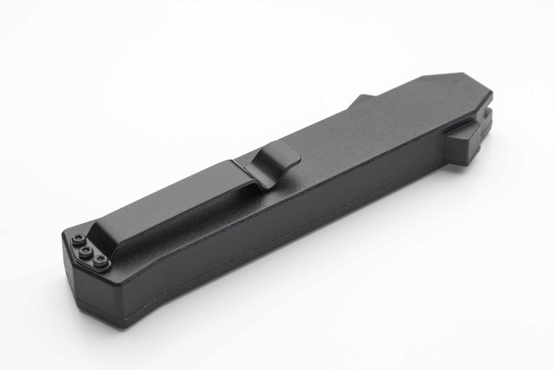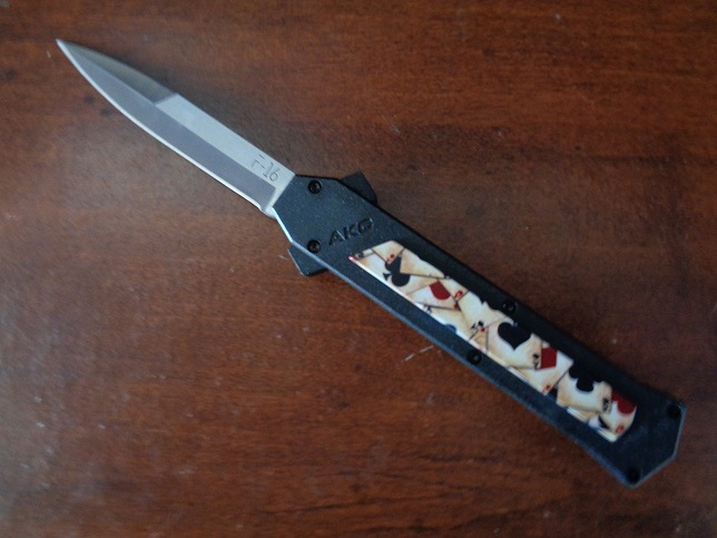 The 2017's news of AKC OTF is called "F16", like the Fighting Falcon supersonic fighter aircraft of United States Air Force. This is an awesome knife, strong and solid mechanism with it's double springs inside for a durable and faster opening. Blade play is almost zero minimum blade play. Press the button forward and the blade rockets out. Pull the firing button back and the blade retracts safely. The action is fast and the knife is light and ergonomic. The aluminium handle has a customizable insert plaquette. Satin razon sharp bayonet blade, black pocket clip. Overall Length: 20cm - 8" Blade Length: 8.5cm - 3.35" Blade thickness: 3mm - 0.12" Weight: 88 g - 3.10 oz. Blade Material: 440A Stainless steel Handle Material: Aluminium Inlay Material: Poker cards