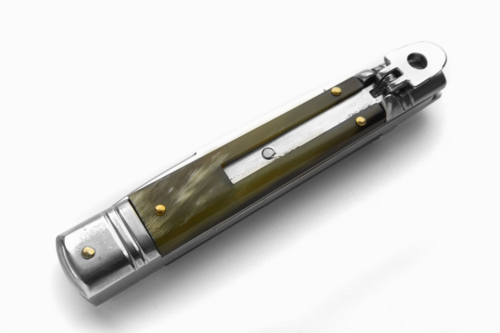 AKC Slim Brazilian Horn Switchblade Leverlock Automatic Knife. This is the slim version of the AKC Italy italian classic 8” leverlock knife. This side opening automatic switchblade has a 440A stainless steel blade and stainless steel bolsters. The handle is made of brazilian horn. Note: as it is a natural material, colour, texture and pattern will vary from knife to knife. Overall Length: 20cm - 7.8" Blade Length: 8,2cm - 3.2" Blade thickness: 3mm - 0.11" Weight: 90gr - 3.1oz Blade Material: 440A Stainless Steel Handle Material: Brazilian Horn Made in: Italy