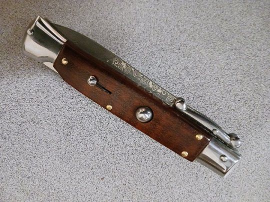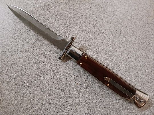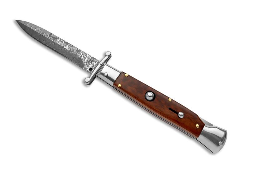 AKC Swinguard 9" Italian Automatic Stiletto Snakewood Damascus. This real Italian Stiletto in the swinguard style is sure to be the next item in your Italian knife collection. The bayonet blade releases powerfully at the push of a button. The handle is crafted from beautiful premium material. This pocket knife includes a sliding safety to protect against accidental release and the lockback is secure. If you're looking for a beautiful Italian blade, this is the one for you. Italian Stilettos are handmade using traditional knife-making techniques. As a result they will have a more rustic fit and finish than most production knives. These traditional Italian knives are intended more for collection and display, rather than hard EDC use. Overall lenght: 23cm – 9" Blade Lenght: 9.65 cm – 3.8" Blade Thickness: 0.25cm – 0.10" Weight: 130.4 gr- 4.6 oz Blade Material: Stainless steel Handle Material: Snake Wood