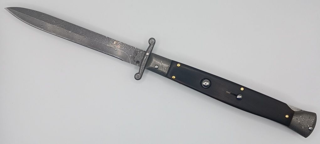 AKC World 11" Ebony Wood Damascus Italian Swinguard Automatic Knife. We present a classic Italian-style knife: the 28 cm Swinguard. Elegant, featuring a fast automatic opening mechanism and rock-solid lock-up when deployed, this knife represents an excellent purchase — especially considering its outstanding quality-to-price ratio. The handle is crafted from [Ebony, while the blade and liners are made of Damascus steel. Overall length: 28cm – 10,90" Blade Length: 11,4cm – 4,60" Blade Thickness: 0,3cm – 0,11" Weight: 168gr - 5.92oz Blade Material: Damascus Handle Material: Ebony Frame material: Damascus