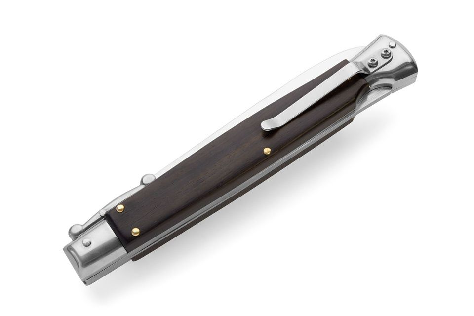 AKC World 11" Ebony Wood Italian Swinguard Automatic Knife. We present a classic Italian-style knife: the 28 cm Swinguard. Elegant, featuring a fast automatic opening mechanism and rock-solid lock-up when deployed, this knife represents an excellent purchase — especially considering its outstanding quality-to-price ratio. The handle is crafted from Ebony, while the blade and liners are made of stainless steel. Overall length: 28cm – 10,90" Blade Length: 11,4cm – 4,60" Blade Thickness: 0,3cm – 0,11" Weight: 168gr - 5.92oz Blade Material: Stainless steel Handle Material: Ebony Frame material: Stainless steel