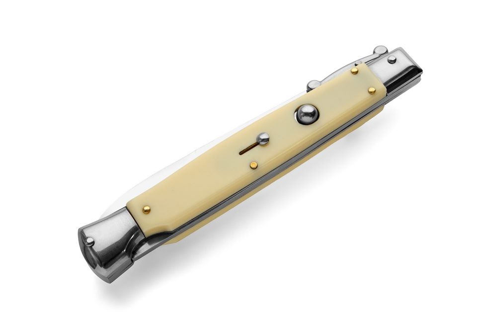 AKC World 11" Imitation Ivory Italian Swinguard Automatic Knife. We present a classic Italian-style knife: the 28 cm Swinguard. Elegant, featuring a fast automatic opening mechanism and rock-solid lock-up when deployed, this knife represents an excellent purchase — especially considering its outstanding quality-to-price ratio. The handle is crafted from Imitation Ivory, while the blade and liners are made of stainless steel. Overall length: 28cm – 10,90" Blade Length: 11,4cm – 4,60" Blade Thickness: 0,3cm – 0,11" Weight: 171gr - 6oz Blade Material: Stainless steel Handle Material: Imitation Ivory Frame material: Stainless steel