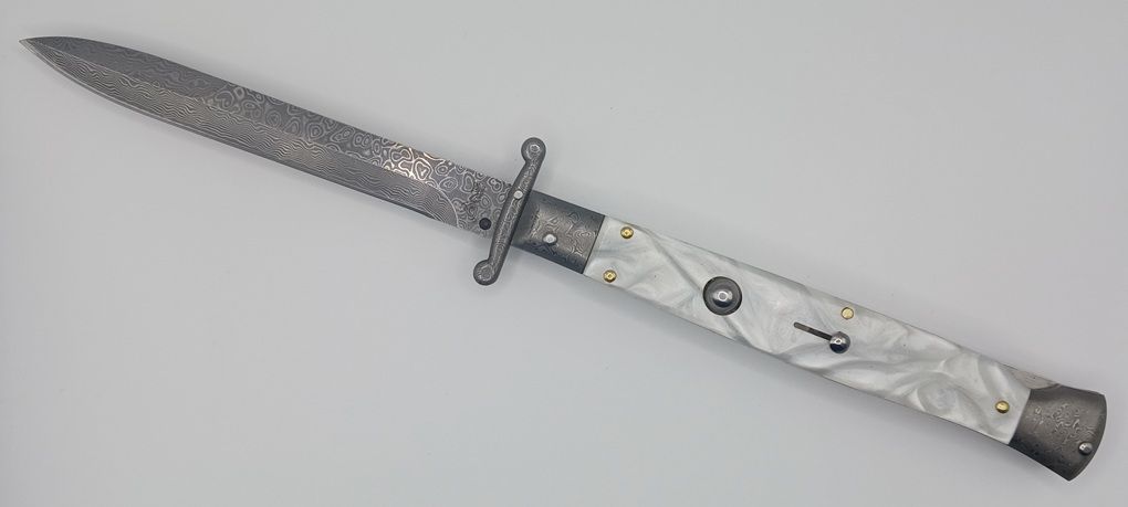 AKC World 11" Imitation Pearl Damascus Italian Swinguard Automatic Knife. We present a classic Italian-style knife: the 28 cm Swinguard. Elegant, featuring a fast automatic opening mechanism and rock-solid lock-up when deployed, this knife represents an excellent purchase — especially considering its outstanding quality-to-price ratio. The handle is crafted from Imitation Pearl, while the blade and liners are made of Damascus Steel. Overall length: 28cm – 10,90" Blade Length: 11,4cm – 4,60" Blade Thickness: 0,3cm – 0,11" Weight: 172gr - 6.1oz Blade Material: Stainless steel Handle Material: Imitation Pearl Frame material: Damascus Steel