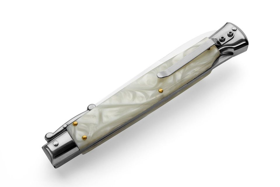 AKC World 11" Imitation Pearl Italian Swinguard Automatic Knife. We present a classic Italian-style knife: the 28 cm Swinguard. Elegant, featuring a fast automatic opening mechanism and rock-solid lock-up when deployed, this knife represents an excellent purchase — especially considering its outstanding quality-to-price ratio. The handle is crafted from Imitation Pearl, while the blade and liners are made of stainless steel. Overall length: 28cm – 10,90" Blade Length: 11,4cm – 4,60" Blade Thickness: 0,3cm – 0,11" Weight: 171gr - 6oz Blade Material: Stainless steel Handle Material: Imitation Pearl Frame material: Stainless steel