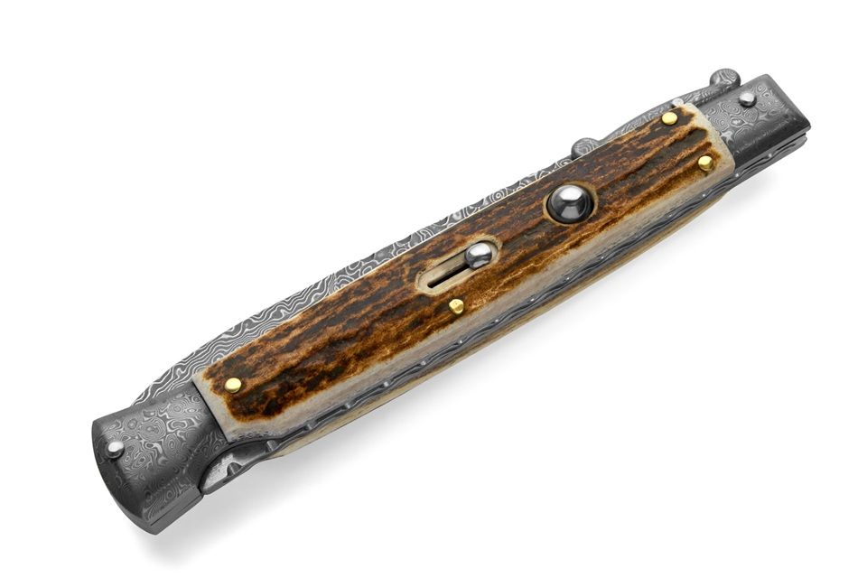 AKC World 11" Stag Horn File Work Damascus Italian Swinguard Automatic Knife. We present a classic Italian-style knife: the 28 cm Swinguard. Elegant, featuring a fast automatic opening mechanism and rock-solid lock-up when deployed, this knife represents an excellent purchase — especially considering its outstanding quality-to-price ratio. The handle is crafted from stag horn, while the blade and liners are made of Damascus steel. A special detail that adds a real touch of class is the beautifully executed file work on the spring. Overall length: 28cm – 10,90" Blade Length: 11,4cm – 4,60" Blade Thickness: 0,3cm – 0,11" Weight: 176gr - 6.21oz Blade Material: Damascus Handle Material: Stag Horn Frame material: Damascus