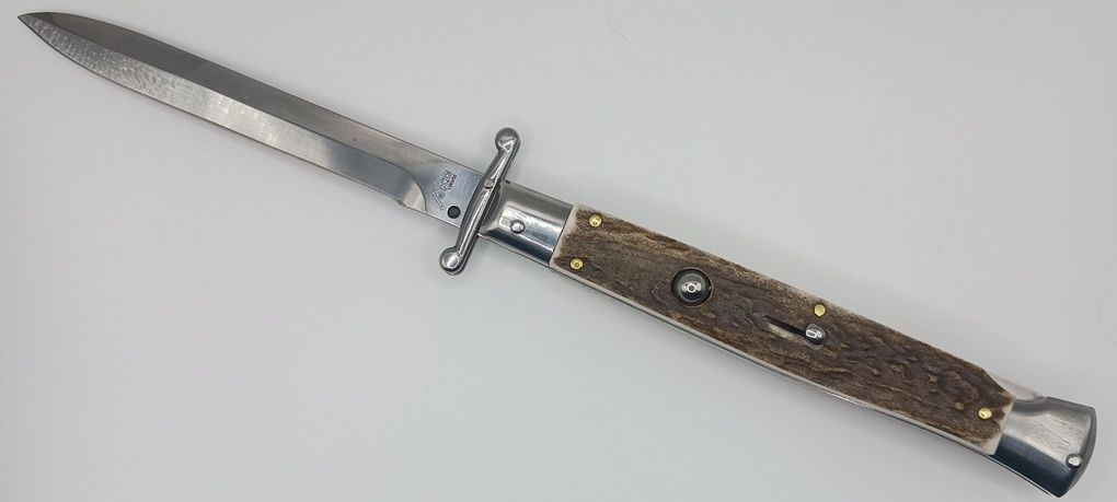 AKC World 11" Stag Horn Italian Swinguard Automatic Knife. We present a classic Italian-style knife: the 28 cm Swinguard. Elegant, featuring a fast automatic opening mechanism and rock-solid lock-up when deployed, this knife represents an excellent purchase — especially considering its outstanding quality-to-price ratio. The handle is crafted from stag horn, while the blade and liners are made of stainless steel. Overall length: 28cm – 10,90" Blade Length: 11,4cm – 4,60" Blade Thickness: 0,3cm – 0,11" Weight: 179gr - 6.31oz Blade Material: Stainless steel Handle Material: Stag Horn Frame material: Stainless steel
