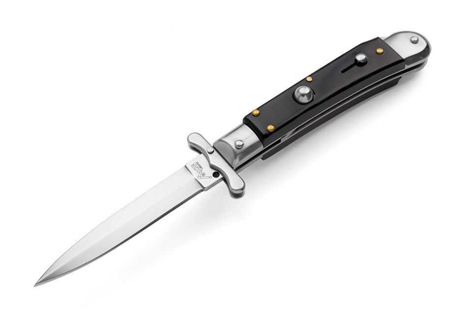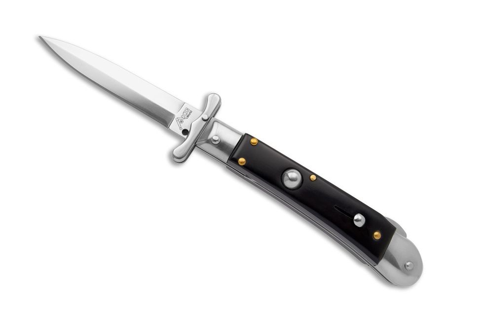AKC World Medici 7.3" Swinguard Automatic Knife Dagger Buffalo Horn. Medici is a new swinguard from AKC World is a new line of italian knives designed in Italy. These are excellent quality knives with Italian style. Very nice shape and good mechanism. Nice for any collection but also as fancy pocket knife. Price quality range is very good. Overall lenght: 18.5cm – 7.3" Blade Lenght: 7 cm – 2.76" Blade Thickness: 0,3cm – 0,11" Weight: 94 gr-3.4oz Blade Material: AISI 420 stainless steel Handle Material: Buffalo Horn Frame material: AISI 420 stainless steel