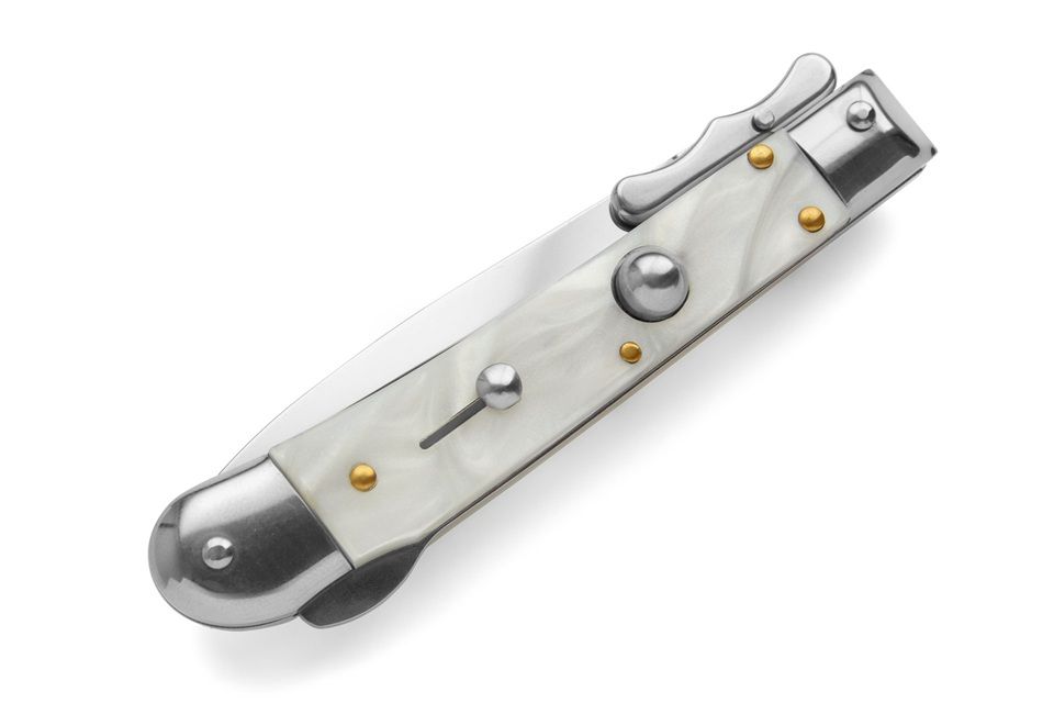 AKC World Medici 7.3" Swinguard Automatic Knife Dagger Imitation Pearl. Medici is a new swinguard from AKC World is a new line of italian knives designed in Italy. These are excellent quality knives with Italian style. Very nice shape and good mechanism. Nice for any collection but also as fancy pocket knife. Price quality range is very good. Overall lenght: 18.5cm – 7.3" Blade Lenght: 7 cm – 2.76" Blade Thickness: 0,3cm – 0,11" Weight: 93 gr-3.3oz Blade Material: AISI 420 stainless steel Handle Material: Imitation Pearl Frame material: AISI 420 stainless steel