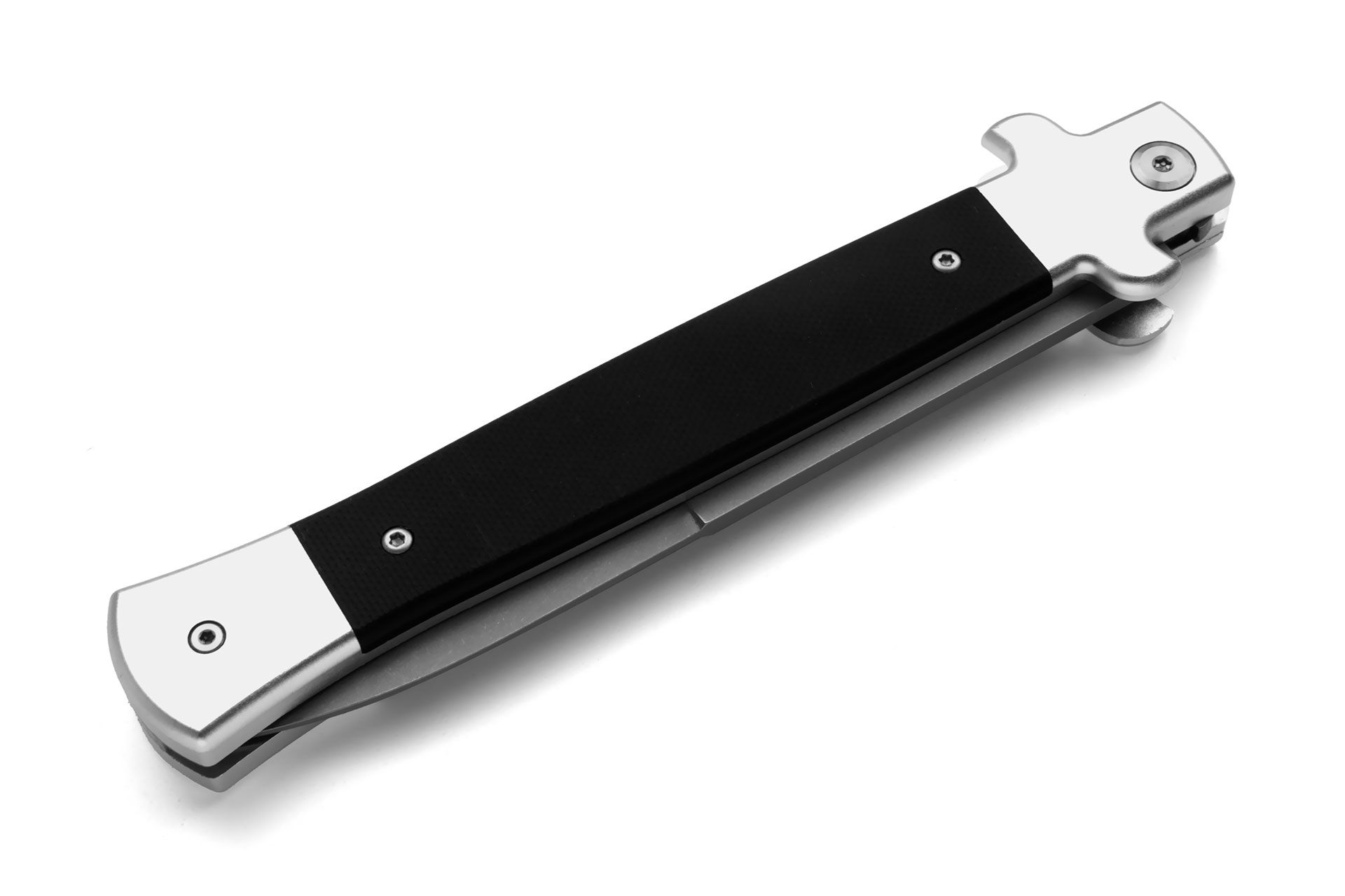 AKC X-Treme Shadow 11" Black G-10 Stiletto Automatic Knife D2 Stone Washed Bayo. To unlock the blade, simply press the top bolster upward, and the same action is repeated for closing it securely. Overall length: 28cm – 11" Blade Length: 11.5 cm – 4.53" Blade thickness: 3mm - 0,12" Weight: 142 gr-5 oz Blade Material: G10 Handle Material: D2 Stone Washed Made in: China