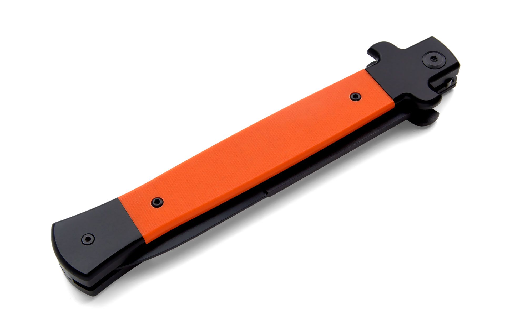 AKC X-Treme Shadow 11" Orange Stiletto Automatic Knife Black Bayo. To unlock the blade, simply press the top bolster upward, and the same action is repeated for closing it securely.Overall length: 28cm – 11" Blade Length: 11.5 cm – 4.53" Blade thickness: 3mm - 0,12" Weight: 142 gr-5 oz Blade Material: D2 Pvd Handle Material: G10 Made in: China