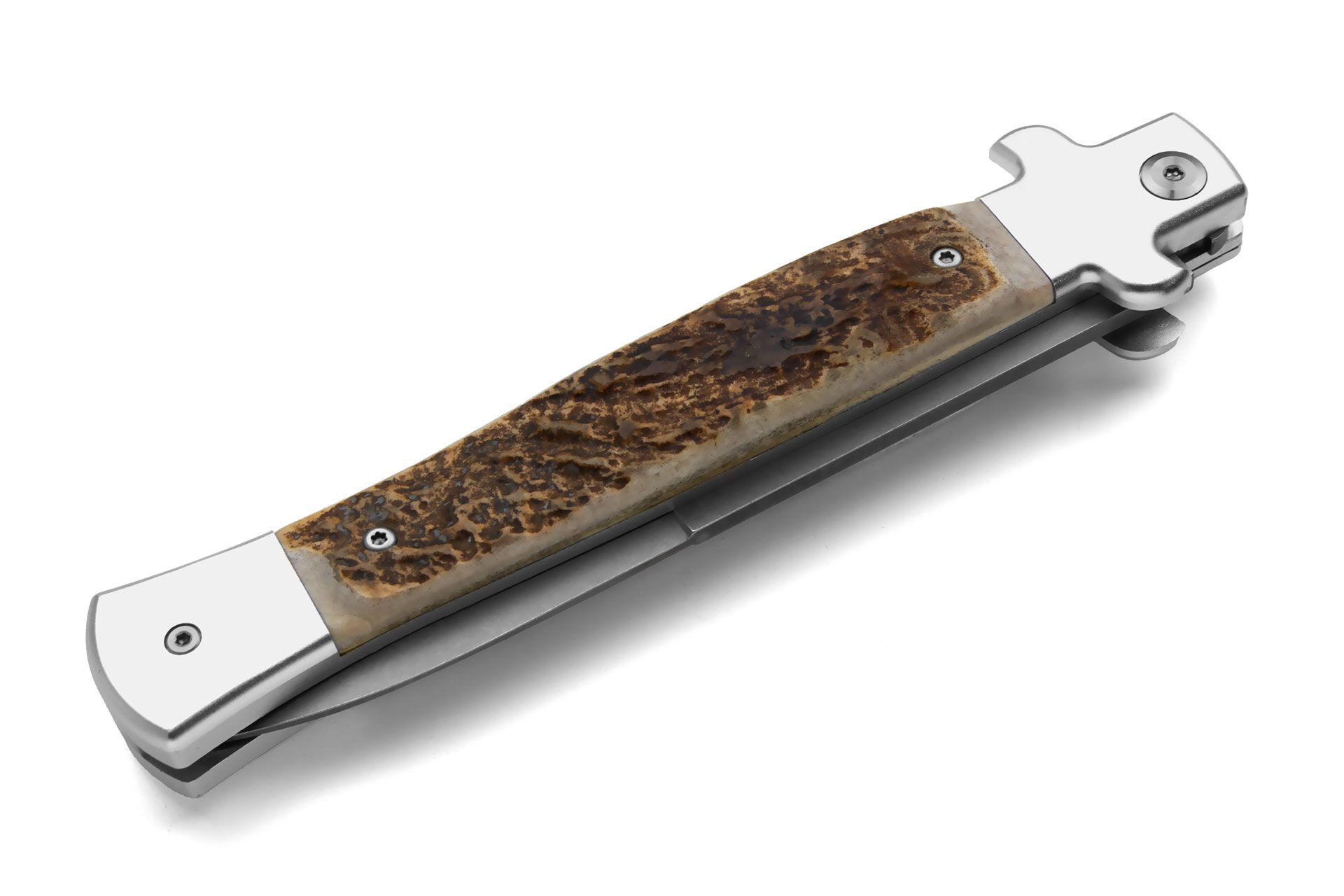 AKC X-Treme Shadow 11" Stag Horn Stiletto Automatic Knife 440c Stone Washed Bayo. To unlock the blade, simply press the top bolster upward, and the same action is repeated for closing it securely. Overall length: 28cm – 11" Blade Length: 11.5 cm – 4.53" Blade thickness: 3mm - 0,12" Weight: 153 gr-5.40 oz Blade Material: 440C Stone washed steel Handle Material: Stag Horn Made in: China