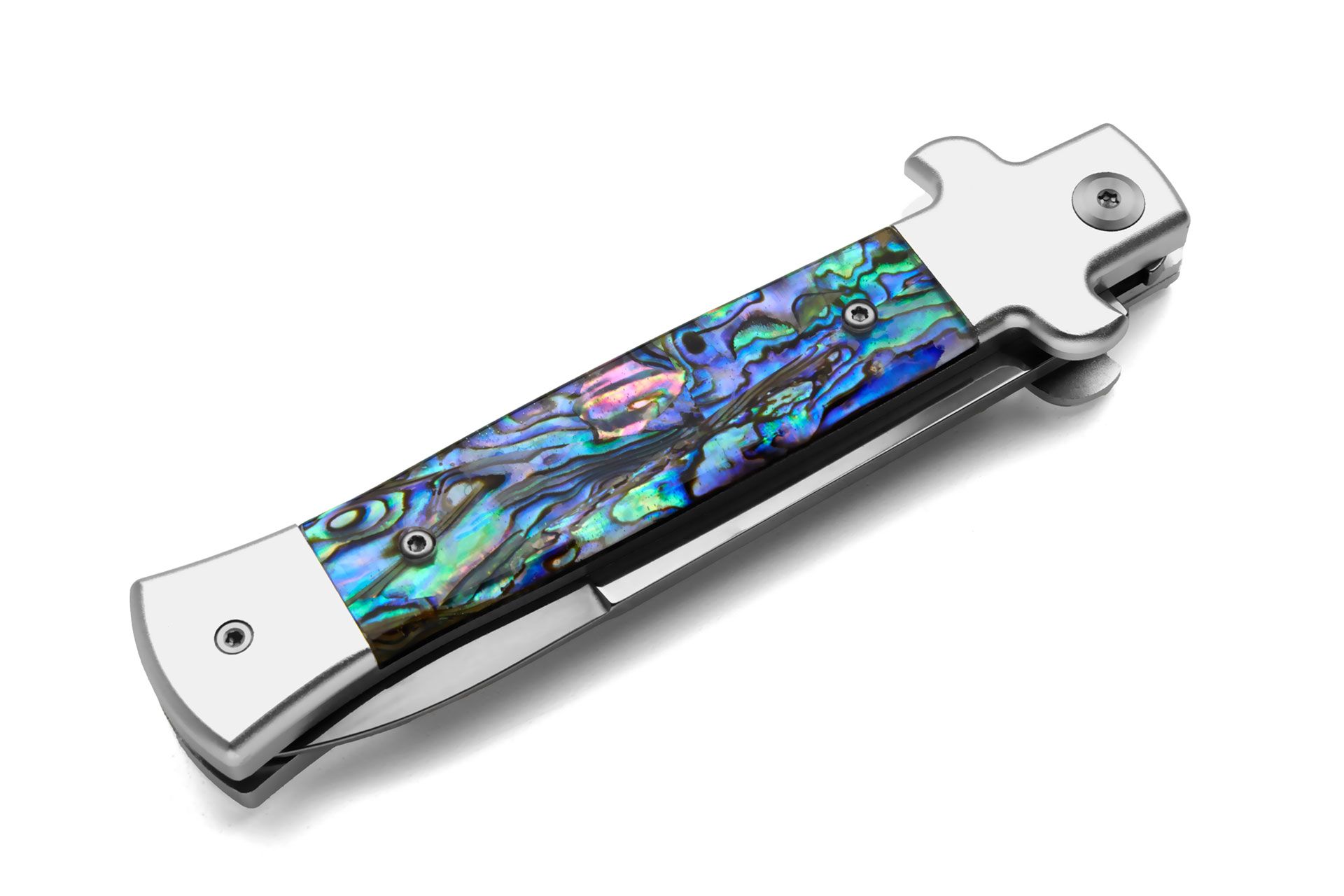 AKC X-Treme Shadow 9" Abalone Stiletto Automatic Knife 440c Polished Bayo. Overall length: 23cm – 9" Blade Length: 9.6 cm – 3.78" Blade thickness: 3mm - 0.12" Weight: 106 gr-3.74 oz Blade Material: 440BC Steel mirror Handle Material: Abalone Shell Made in: China