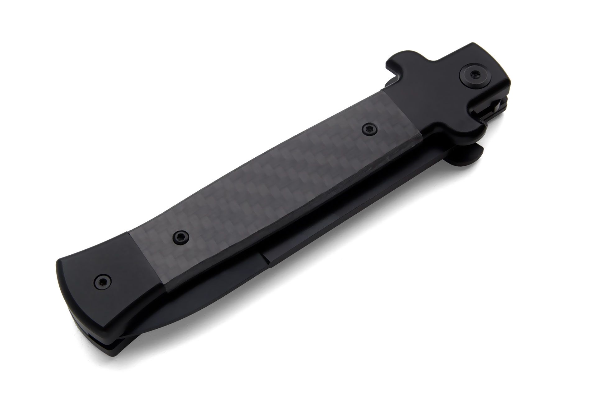 AKC X-Treme Shadow 9" Carbon Fiber Stiletto Automatic Knife D2 Black Bayo. To unlock the blade, simply press the top bolster upward, and the same action is repeated for closing it securely. Overall length: 23cm – 9" Blade Length: 9.6 cm – 3.78" Blade thickness: 3mm - 0.12" Weight: 111 gr-3.91 oz Blade Material: D2 Pvd Handle Material: Carbon Fiber Made in: China