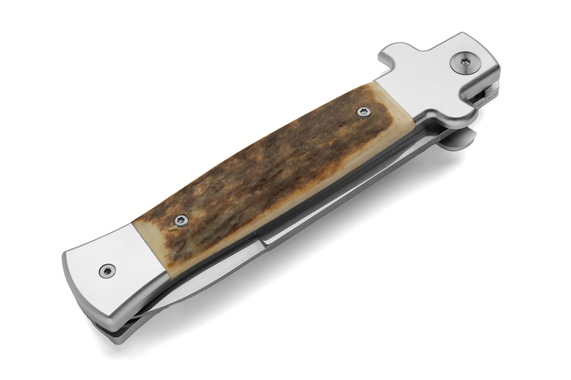 AKC X-Treme Shadow 9" Stag Horn Stiletto Automatic Knife 440c Polished Bayo. Overall length: 23cm – 9" Blade Length: 9.6 cm – 3.78" Blade thickness: 3mm - 0.12" Weight: 113 gr-4 oz Blade Material: 440C Steel mirror Handle Material: Stag Horn Made in: China
