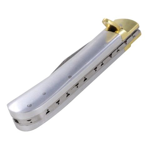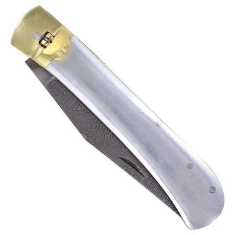 This custom handmade lever lock knife is just stunning. The smooth polished steel handle draws the eye and holds it there. The inner framework is also composed of solid steel, giving the knife a classy look. Several pins hold the handle together, and are smoothed and contoured with the mounts for an overall flush appearance. The bolster and lever are constructed from pure brass with a sleek and stylish design. The spine has excellent file work that leads to the beautiful Damascus steel blade. In a Turkish Clip Point style with a gorgeous and unique wave pattern, this blade knocks it out of the park. What a catch! As if that isn’t enough to seal the deal, the best part hands down would have to be the automatic function that you can deploy using the free-falling lever. Just one push with your thumb and that’s all it takes for the blade to open lightning fast. Overall Length: 9 Inches, Blade Length: 4 Inches
