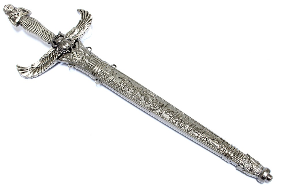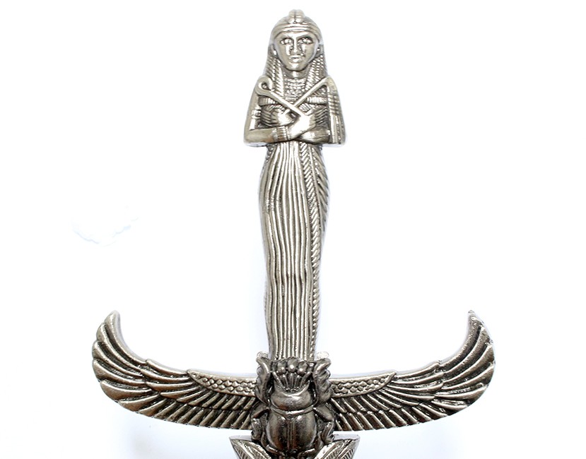 Anu Egyptian Winged Dagger Kriss. 13.5" Overall Dagger Blade Length: 8" Handle Length: 4.5" Sheath Length: 9" Silver Colored Handle and Sheath Very Detailed Egyptian Dagger Collectible Item None Edge Blade
