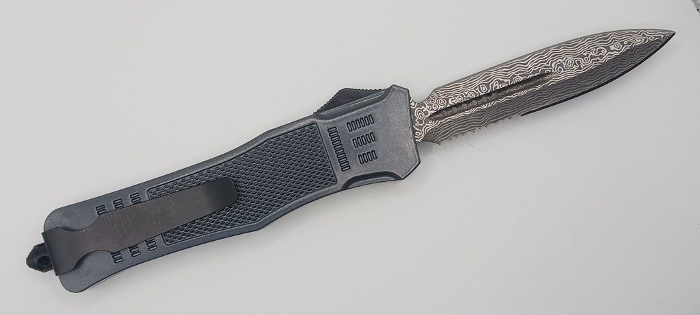 Army Pin Up Girl D/A OTF Automatic Knife Damascus Dagger Serrated. Overall Length: 24cm - 9.4" Blade Length: 9,8cm - 3.8" Blade thickness: 2.5mm - 0.11" Weight: 285gr - 10oz Blade Material: Damascus steel Handle Material: Aluminum Coated Inlay Material: Aluminum Made in: China