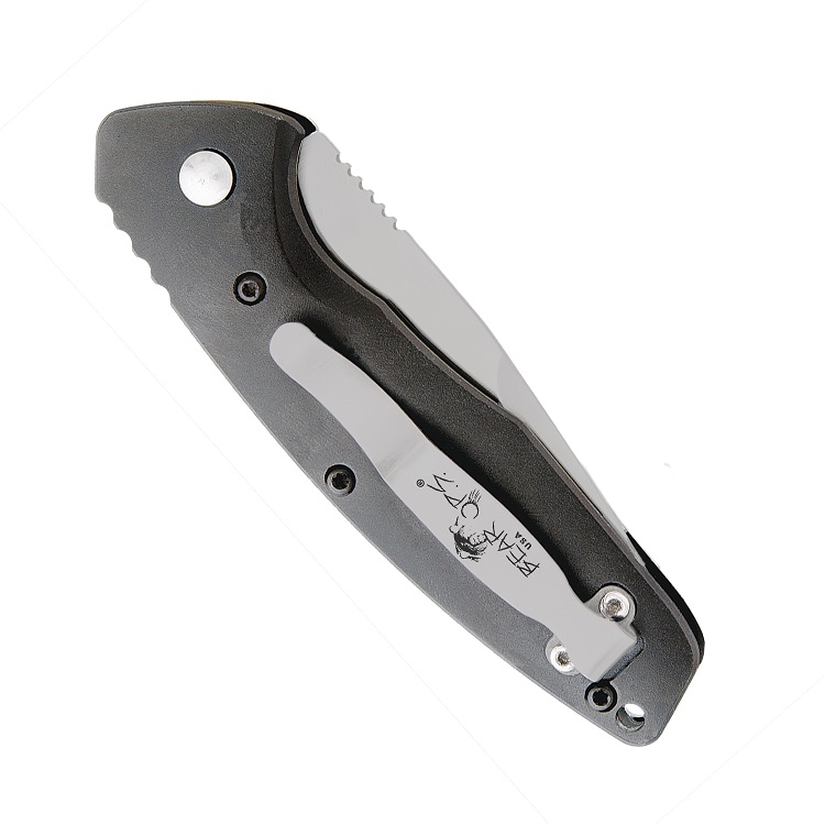 Bear & Son Black Bold Action X Automatic Knife Drop Point. Bold Action X Blade Material : Sandvik 14C28N Stainless Steel Handle Material : Black Aluminum Open Length : 7-1/8″ Closed Length : 4-1/8″ Blade Length : 3″ Weight : 3.2 oz. Extras : Automatic Opening & Safety Lock & Reversible Pocket Clip Origin: USA