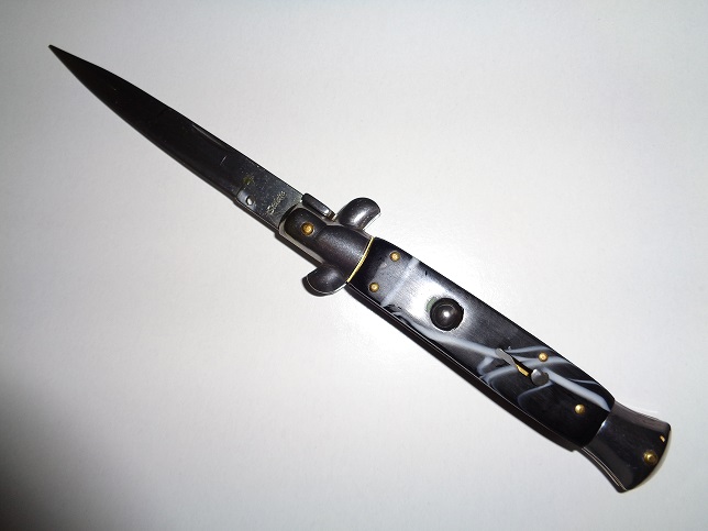 Befitting the Italian title of The Grand or The Great, this deluxe 9.75 inch version of the Italian Stiletto has a piercing pin point tip and razor-sharp edge. When swiftly deployed via a highly reliable automatic switch, the beautiful bayonet-style blade extends out to a reach of a full 4 inches. Featuring a highly attractive black marble resin topped off with shiny brass rivets, the sturdy handle feels great in the hand and offers a solid grip. The sleek stainless steel blade is 2.9 mm thick and remains safe and secure when not in use thanks to a safety mechanism. Includes a FREE black nylon sheath with sturdy belt loop. Specifications Overall Length: 9.75 Inches Blade Length: 4 Inches Blade Material: 440 Stainless Steel Silver Finish Handle Length: 5.5 Inches Handle Material: Stainless Steel with Black Marble Resin Features 440 Stainless Steel Blade Stainless Steel with Black Marble Resin Handle Brass Rivets Free Nylon Case with Belt Loop