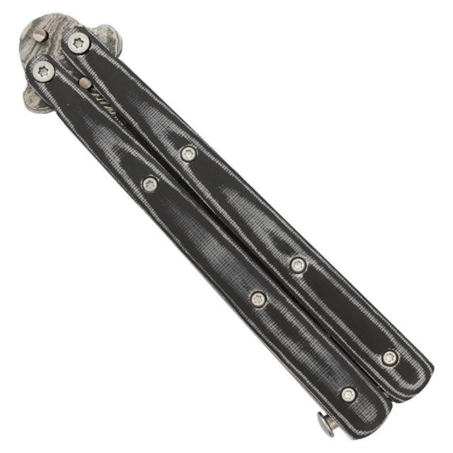 Best Value Heavy Duty Black Micarta Butterfly Knife Tanto Point Damascus Plain. Sporting a Damascus steel tanto point blade, the slim build and good weight of this balisong butterfly knife delivers nice action in an attractive package. The distinctive Micarta construction handle is decorated with an attractive black and grey wooden pattern which is attached to the steel inner framing with a torque screw. A metal safety latch is included to lock the blade into place when it is not in use as well as when it is deployed. The blade offers blood grooves on both sides allowing for a more balanced blade. Also known as a balisong, a butterfly knife or fan knife is a folding pocket knife with two handles counter-rotating around the tang such that, when closed, the blade is concealed within grooves in the handles. Butterfly knives are especially useful in situations where it is inconvenient to use both hands to open a knife. Please make sure to check your local laws regarding the procession and import of these knives. Overall Length: 9 Inches, Blade Length: 4 Inches