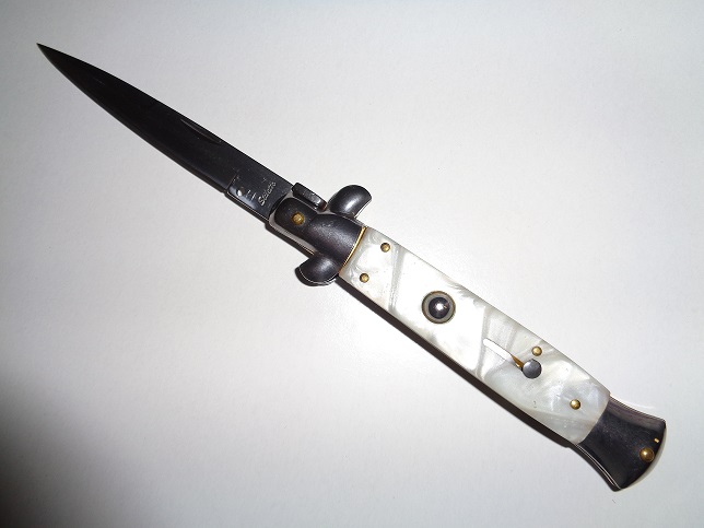 Best Value White Pearl Milano Stiletto Automatic Knife (9.75" Overall). If your looking for a perfect gift to give to someone inexpensively, this is it! These stilettos are made with the word stiletto stamped into the blade. These are better built with a little heavier construction than the normal chinese made versions. 9.5 Inches total length with a 4 inch 440 stainless steel blade.