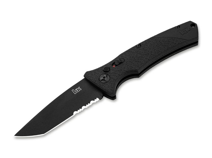 Boker Heckler & Koch Black Automatic Knife Tanto Black Serrated. The Heckler & Koch automatic knives FD01 & FD02 are tactical no-nonsense function folders of the purest calibre. The reliable mechanisms with a side blade opening, coil spring and button lock have proven themselves hundreds of thousands of times over in the Kalashnikov and Boker Plus series of switchblade knives for more than a decade. The lock is equipped with an additional side-mounted slide-lock for safe handling. The D2 steel blades are black coated. The handle is made of steel liners and fibre-reinforced nylon (FRN). The nylon has the characteristic moon and knob texture of the handles of Heckler & Koch military and government handguns. The knives are equipped with a pocket and belt clip for tip-up (r) carry and are available in two versions with different blade shapes. The Heckler & Koch FD01 is the fully tactical version of the tactical switchblade knife with a robust tanto blade and half serrated edge (combo edge) for cutting fibrous materials such as webbing and rope. Type: Pocket Knives Brand: Heckler & Koch Overall Length: 7.91 in Blade Length: 3.27 in Blade Thickness: 0.12 in Weight: 3.95 oz Blade Material: D2 Handle Material: FRN Opener: Push Button Opening: Automatic Lock Type: Button Lock Made in: USA Color: Black Blade Color: Black Item Number: 01HK502