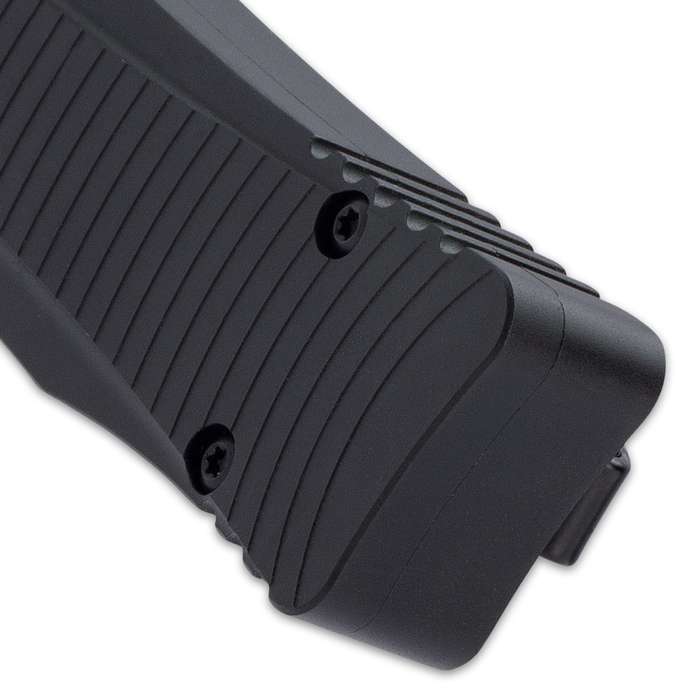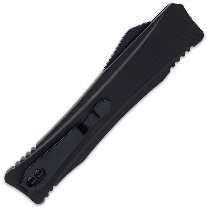 Boker Plus Eagle D/A OTF Automatic Knife Satin Drop Point. An OTF, designed by Raimund Lhotak, that fits perfectly in the hand thanks to its titanium-coated handle and ergonomic design The 3 3/10” 440C stainless steel blade has dynamic grinding lines and can be accessed by spring force via the release slide The black pocket knife fits perfectly in the hand thanks to its titanium-coated handle and ergonomic design The 8 1/5” overall OTF knife has a sturdy metal pocket clip so that it’s easily accessible when it’s needed