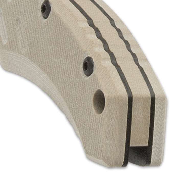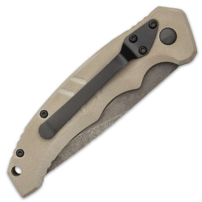 The Coyote Intention was designed as a tactical automatic knife and can easily handle all tactical and everyday cutting tasks It has a 3 1/10” D2 tool steel blade with a stonewashed finish and a textured, G10 handle with a fluted thumb rest The pocket knife is opened with a push button and swings open by means of the tensioned spring behind it This automatic is 7 4/5” in overall length and features a lanyard hole and a tip-down pocket clip for ease of carry