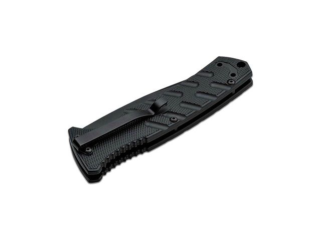 Boker Plus Strike Black Automatic Knife D2 Tanto Serrated. As a lightweight EDC knife, the Boker PlusStrike rounds out our broad range of tacticalknives. The ergonomic handle is supported bysteel liners that feature textured, lightweight,milled aluminum scales. Deep jimping on thepronounced thumb groove facilitates a securehand position. The push button lock withsafety (fully automatic!) prevents accidentaldeployment and additionally secures theclosed knife. The blade is made of ruggedD2 steel. Includes pocket clip. Blade length:3.37". Thickness: 3mm. Overall length: 8.00".Weight: 4.8 oz.