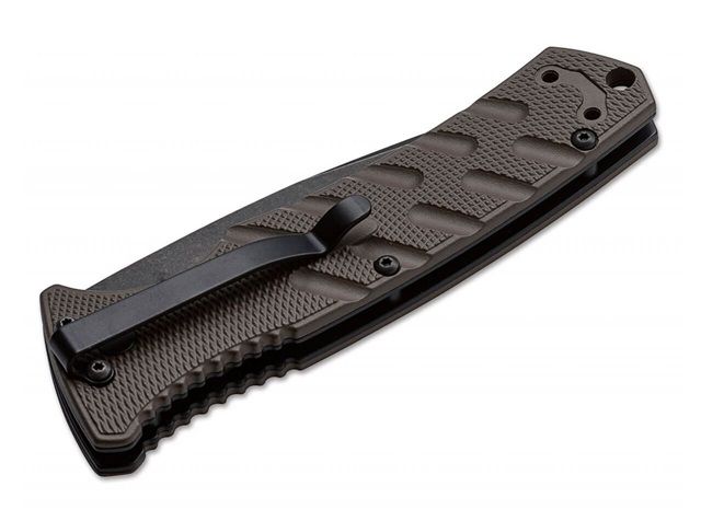 Boker Plus Strike Coyote Brown Automatic Knife D2 Tanto Serrated. As a lightweight EDC knife, the Boker PlusStrike rounds out our broad range of tacticalknives. The ergonomic handle is supported bysteel liners that feature textured, lightweight,milled aluminum scales. Deep jimping on thepronounced thumb groove facilitates a securehand position. The push button lock withsafety (fully automatic!) prevents accidentaldeployment and additionally secures theclosed knife. The blade is made of ruggedD2 steel. Includes pocket clip. Blade length:3.37". Thickness: 3mm. Overall length: 8.00".Weight: 4.8 oz. Available in five versions.