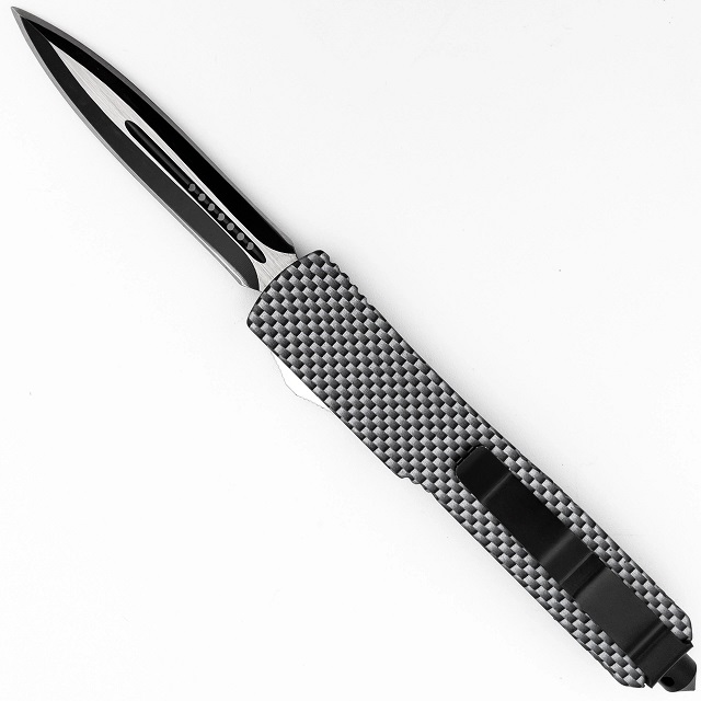 Checkered Flag D/A OTF Automatic Knife Two Tone Dagger. The blade is constructed from stainless steel with a two-tone finish and spear point style. Circular fullers run half along the blood groove of the blade. carbon fiber finish of the zinc alloy handle and black hardware. emergency glass breaker on the end of the handle. a free nylon carrying case is included. Overall Length: 8.38 Inches, Blade Length: 3.38 inches