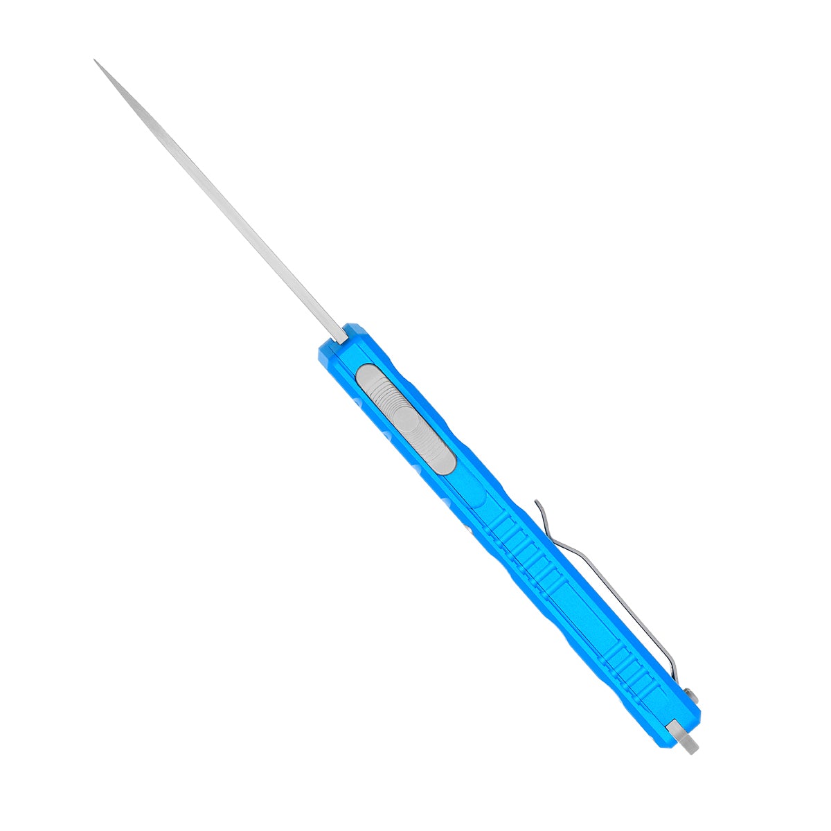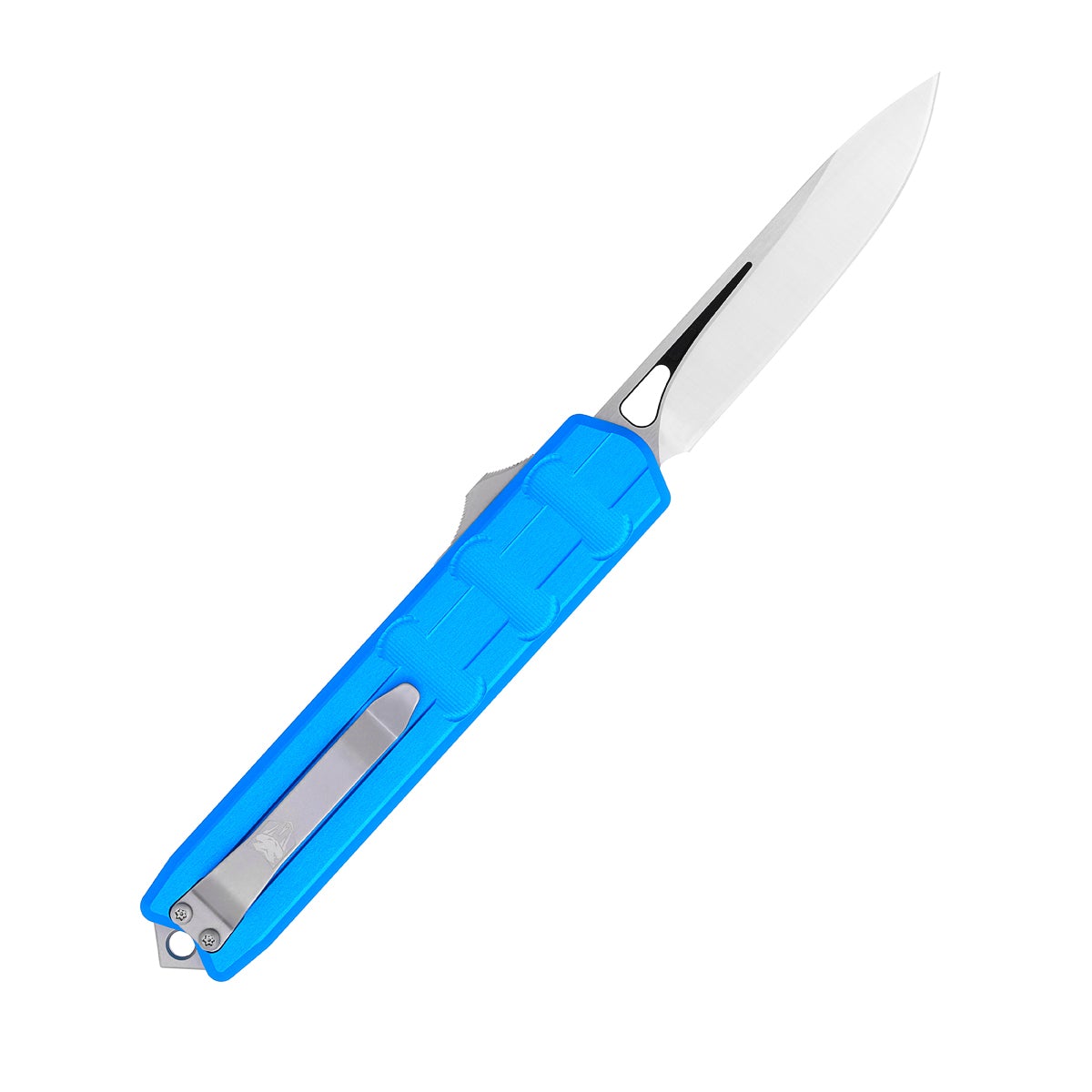 CobraTec Enforcer Blue D/A OTF Automatic Knife Drop Point. CobraTec Enforcer Blue D/A OTF Automatic Knife Drop Point. CobraTec would like to introduce you to the Enforcer. The handle is made of 6061-T6 with a textured design that allows you to have a secured grip. The handle and the internal parts are all cnc machined to offer a precision fit and to allow a very smooth operation. The Enforcer comes with a M390 drop not serrated blade. M390 is considered one of the best all around blade steels. It offers excellent edge retention, corrosion resistant and durability. This is one of the best everyday carry OTF knives you will find. Backed by their Lifetime Warranty. Weight: 3.5 oz Blade Length: 3.25" Handle Length: 4.75" Total Length: 8.25
