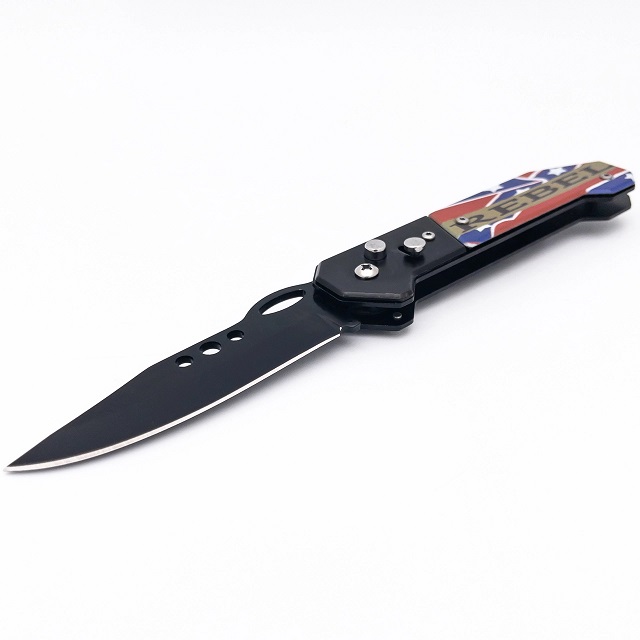 Confederate Flag Rebel Automatic Knife Black Drop Point. Overall Length: 8.125 Inches Blade Length: 3.375 Inches Blade Width: 0.875 Inch Blade Thickness: 2.5mm Blade Type: Drop Point Deployment: Automatic Switchblade Handle Construction: Steel Lining, Polymer Overlay Handle Design: Flag or Camo, as seen in picture. Features: Locking Switch (safety), Pocket Clip
