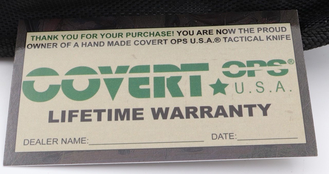 Covert Ops USA Black D/A OTF Automatic Knife Two Tone Karambit. automatic double action OTF knife with the button placed along the spine. 3” stainless steel curved blade with a Two Tone finish. 9” overall with pocket clip and belt sheath. Comes with a limited lifetime warranty.