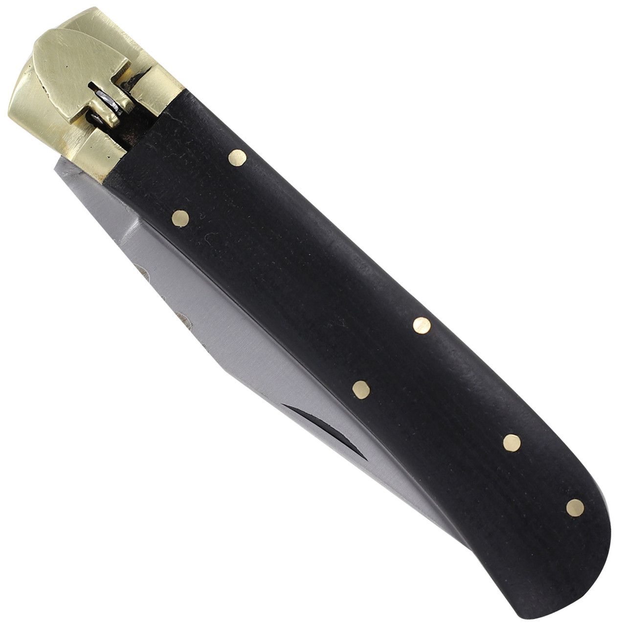D2 Tool Steel Black Micarta Leverlock Automatic Knife File Work. Overall Length: 9 Inches Blade Length: 4 Inches Blade Width: 0.75 Inch Blade Thickness: 3.02 mm Blade Style: Clip Point Blade Construction: D2 tool Steel, Handle Construction: pakkawood, Solid Brass Handle Length: 5.05 Inches Includes: Genuine Leather Sheath file work down the spine
