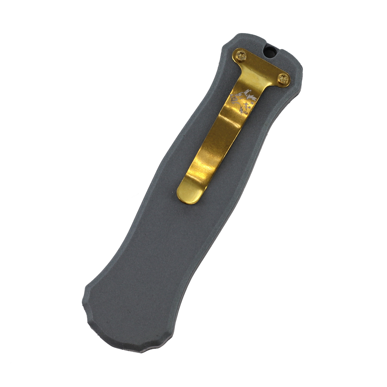 Damascus 5.5" Small Gray D/A OTF Automatic Knife Gold Dagger Serrated. Overall Length: 5.5 inches, Blade Length: 2.125 inches comes with a pocket clip and belt sheath. Deploy the blade with a push of the button forward and retract the blade by pushing the button backwards. This knife has a built in safety so if the blade hits anything on the way out it will pop off track. You have to pull on the blade to re engage it. This knife can be easily cleaned and re adjusted if needed.