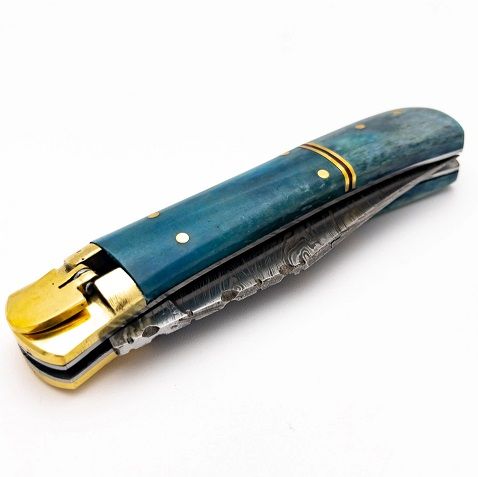 Damascus Blue Bone Leverlock Automatic Knife Clip Point. Overall Length: 9 Inches Blade Length: 4.25 Inches Blade Width: 0.78 Inch Blade Thickness: 3.12 mm Blade Style: Clip Point Blade Construction: Damascus steel, 15N20, 1095 High Carbon Handle Construction: Camel Bone Handle Length: 4.98 Inches Includes: Genuine Leather Sheath Features: Camel Bone Grips