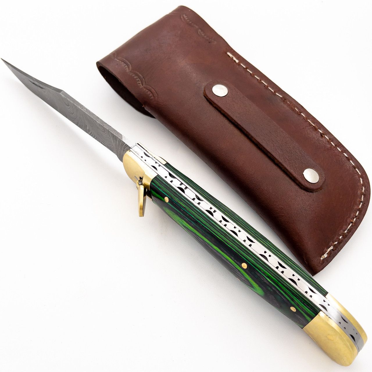 Damascus Green Wood Lever Lock Automatic Knife File Work. Overall Length: 9 Inches Blade Length: 4 Inches Blade Width: 0.75 Inch Blade Thickness: 3.02 mm Blade Style: Clip Point Blade Construction: Damascus Steel, 15N20, 1095 High Carbon Handle Construction: pakkawood, Solid Brass Handle Length: 5.05 Inches Includes: Genuine Leather Sheath file work down the spine
