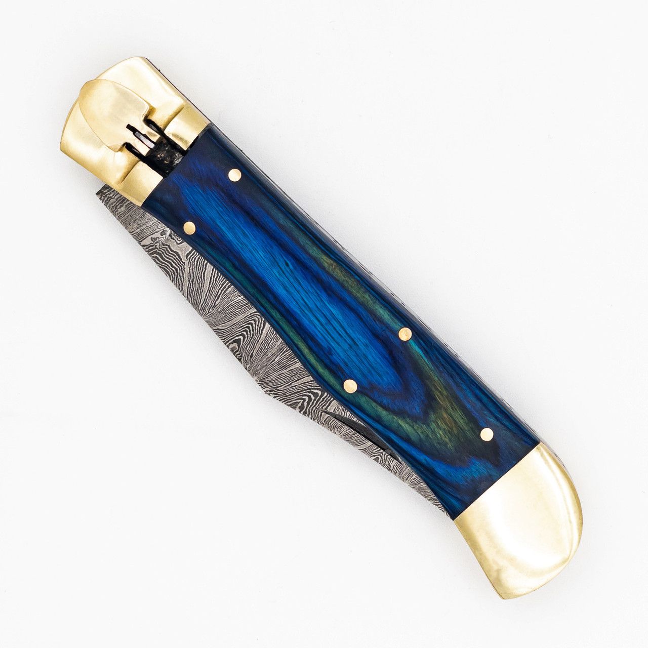 Damascus Ocean Wood Lever Lock Automatic Knife File Work. Overall Length: 9 Inches Blade Length: 4 Inches Blade Width: 0.75 Inch Blade Thickness: 3.02 mm Blade Style: Clip Point Blade Construction: Damascus Steel, 15N20, 1095 High Carbon Handle Construction: pakkawood, Solid Brass Handle Length: 5.05 Inches Includes: Genuine Leather Sheath file work down the spine